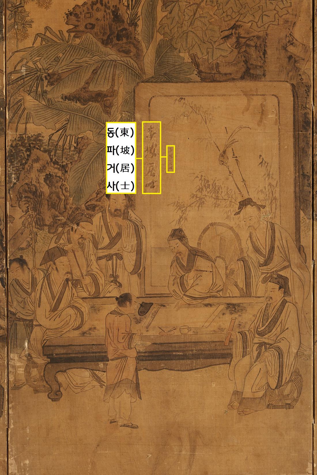 왼쪽에 희미하게 쓰여진 글씨가 있다.‘동파거사(東坡居士)’이다. 김홍도는 왜 16명이 등장하는 ‘서원아집도’에 ‘동파거사’만 써놓았을까.