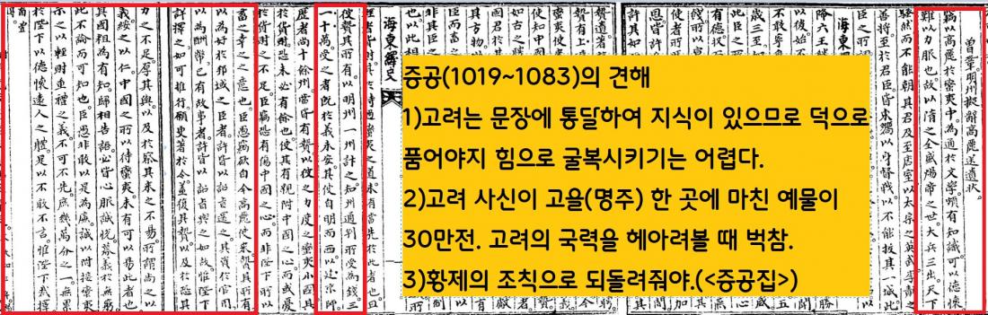 “고려는 문장에 통달하여 지식이 있으므로 덕으로 품어야지 힘으로 굴복시키기는 어렵다…고려사신이 예물로 바친 것이 돈 30만관이나 되는데…고려의 국력을 헤아려볼 때 여유롭지 못하다.”(<증공집> 권35 ‘명주의사고려송유장’)