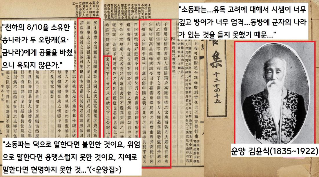 운양 김윤식은 소동파가 편협한 시각으로 유독 고려만 들들 볶고 있다고 비판했다. 김윤식은 “송나라는 천하의 10분의 8을 차지했으면서도 두 오랑캐 나라(요와 금)에게 공물을 바치지 않았느냐”고 아픈 곳을 찔렀다. 김윤식은 “속좁은 소동파야말로 불인하고, 용맹스럽지도 않으며. 현명하지도 않다”고 비판했다.|국립중앙도서관 자료