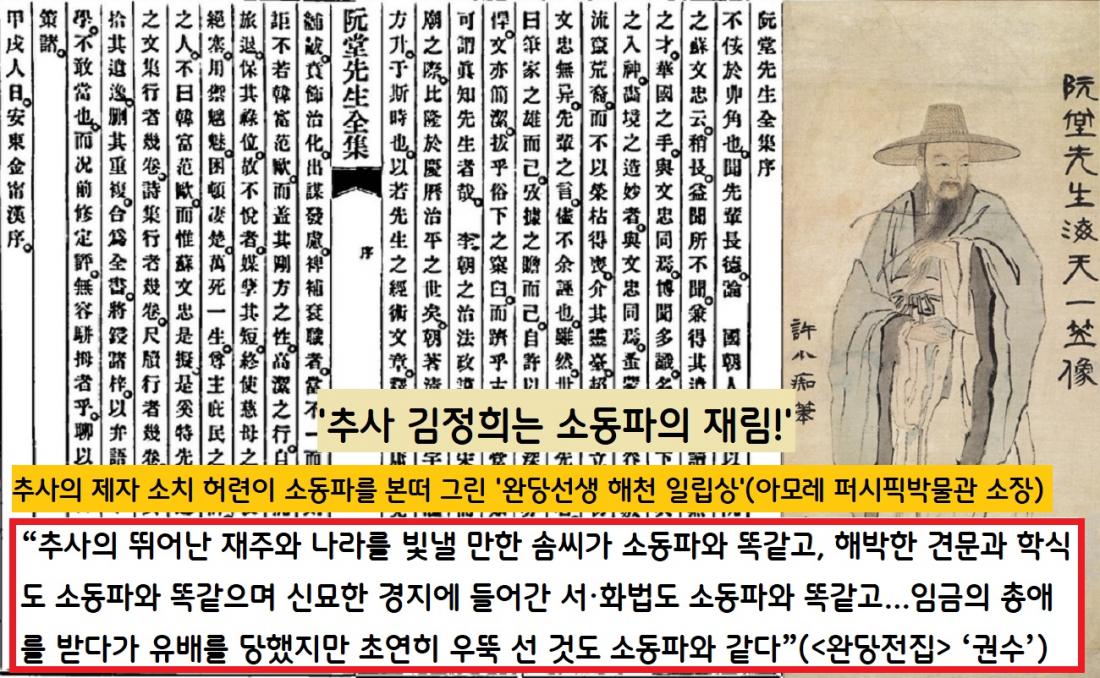 조선말기 유학자인 김영한은 추가 김정희를 ‘소동파의 재림’으로 표현했다. 타고난 재주와 해박한 지식 및 견문, 비범한 서·화법은 물론이고 군주의 총애를 받다가 유배를 다녀온 것도 똑같다고 했다.