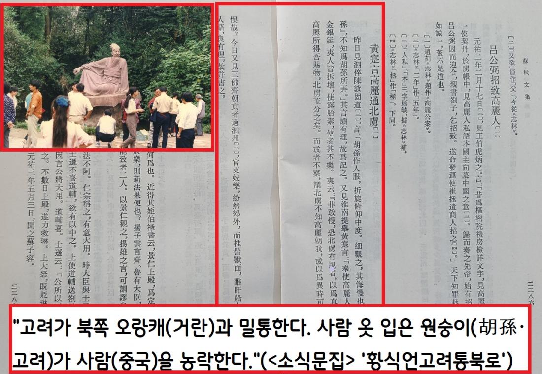 “사람 옷 입은 원숭이(胡孫·고려)가 사람(중국)을 농락한다는 옛말이 맞다.”(<소식문집> 권72 ‘황식이 고려가 북쪽 오랑캐와 통한다고 말하다’) 이게 무슨 막말인가. 고려를 오랑캐는 물론이고, 심지어 ‘원숭이’로 깎아내리고 있다.