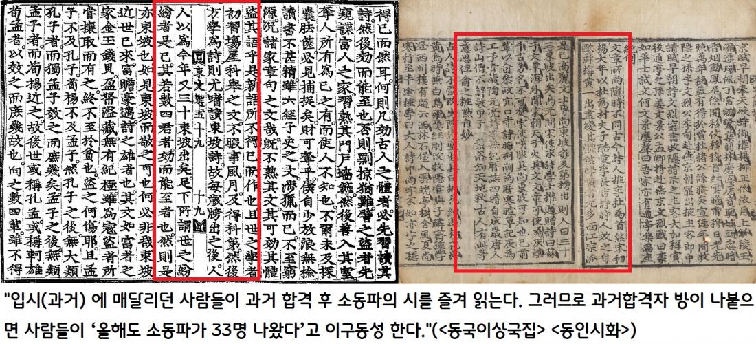 고려의 문장가 이규보는 “입시(과거)’에 매달리던 사람들이 과거 합격 후 소동파의 시를 즐겨 읽는다. 그러므로 과거합격자 방이 나붙으면 사람들이 ‘올해도 소동파가 33명 나왔다’고 이구동성 한다.”고 전했다.|국립중앙도서관·국사편찬위원회 자료
