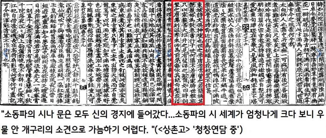 상촌 신흠(1566~1628)은 “소동파의 시와 문장은 모두 신의 경지에 들어갔다”(<상촌고> 권51 청창연단 중)고 극찬했다.