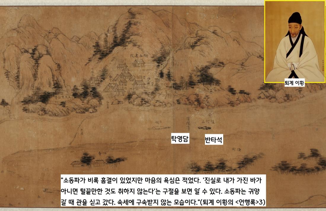 “소동파가 비록 흠결이 있었지만 마음의 욕심은 적었다. ‘내가 가진 바가 아니면 털끝만한 것도 취하지 않는다’는 구절을 보면 알 수 있다. 소동파는 귀양 갈 때 관을 싣고 갔다. 속세에 구속받지 않는 모습이다.”(<퇴계집> ‘언행록 3·유편·산수를 즐김’)