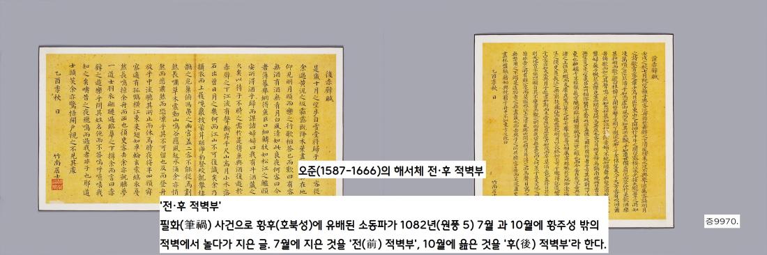조선 중기 문인·학자 정구(1543~1620)는 “소동파의 ‘적벽부’는 인간의 작품이 아니다. 북송의 정이가 살아 있다면 무릎을 꿇고 이 작품을 읽어 주고 싶다. 정선생(정이)도 이 문장(적벽부)을 인정해줄 것”이라고 했다.