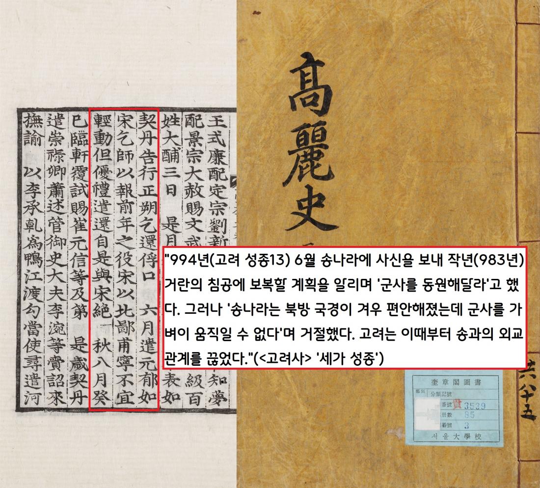 993년 거란의 침공을 서희의 세치 혀로 겨우 막아낸 고려는 이듬해 6월 송나라에 밀사를 보내 거란 협공을 제의했다. 그러나 송나라는 “이제 겨우 변방이 안정되었으니 가벼이 움직일 수 없다”고 거절했다,. 고려는 송과의 관계를 끊을 수밖에 없었다.|규장각한국학연구원 자료