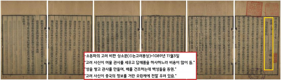 “첫째 고려가 바치는 공물은 허접한 물건인데 반해 송나라가 지출하는 경비는 백성들의 고혈이다. 둘째 고려 사신들이 닿은 곳마다 백성들과 말, 기물 등을 징발하고 영빈관을 수리해야 한다. 셋째 고려가 송나라로부터 받은 하사품을 분명 거란에 넘겨줄 것이다. 이것은 도적에게 무기를 빌려주고 식량을 대주는 것이다.”(1093년의 ‘고려의 서적수매에 따른 이익과 손해에 대한 상소문’)