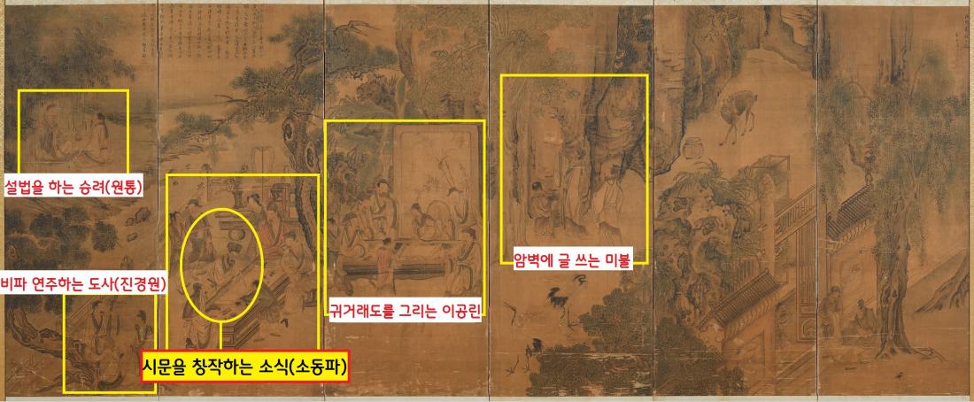 시문을 창작하는 소식, 즉 소동파와, 암벽에 글을 쓰는 미불(1051~1107), ‘귀거래도’를 그리는 이공린(1049~1106), 비파를 연주하는 도사 진경원(1025~1094), 설법을 전하는 승려 원통(1015~1082) 등이 보인다. 5~6폭 위에는 “김홍도의 작품을 ‘신필(神筆)’이라 극찬한 표암 강세황(1713~1791)의 발문이 적혀있다.