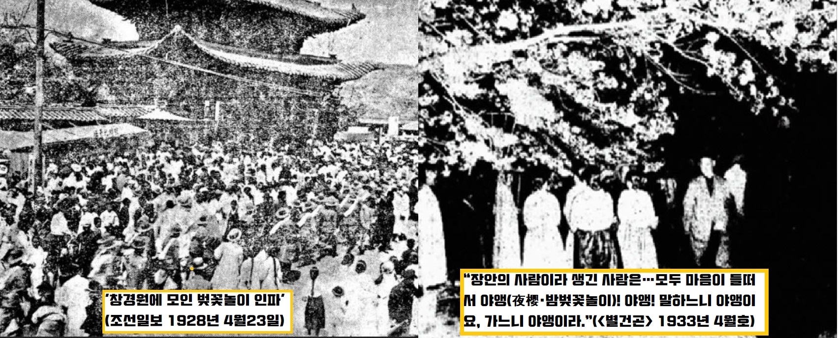 “창경원의 ‘밤벚꽃’은 꽃구경보다도 사람구경이요…창경원을 휩쓸고 다니다가 좀 인적이 드문 데서 여자만 만나면 그저 ‘히야까시’(희롱)이다.”(동아일보 1935년 4월 20일)
