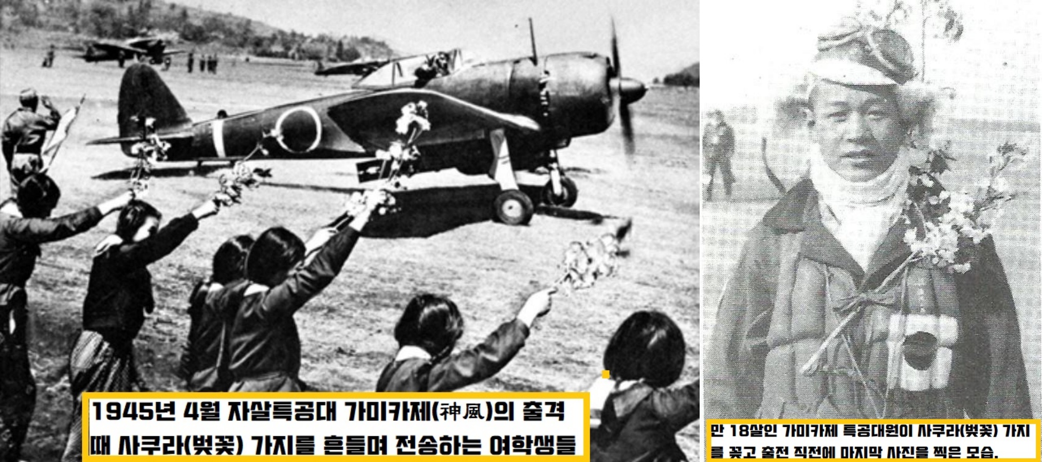 10대 자살 특공대원들이 가미카제(神風)의 출격 직전에 벚꽃가지를 꽂고 찍은 마지막 사진이나, 죽으러 가는 특공대원들을 전송하는 여학생들이 벚꽃가지를 흔드는 모습을 보면 모골이 송연해집니다.