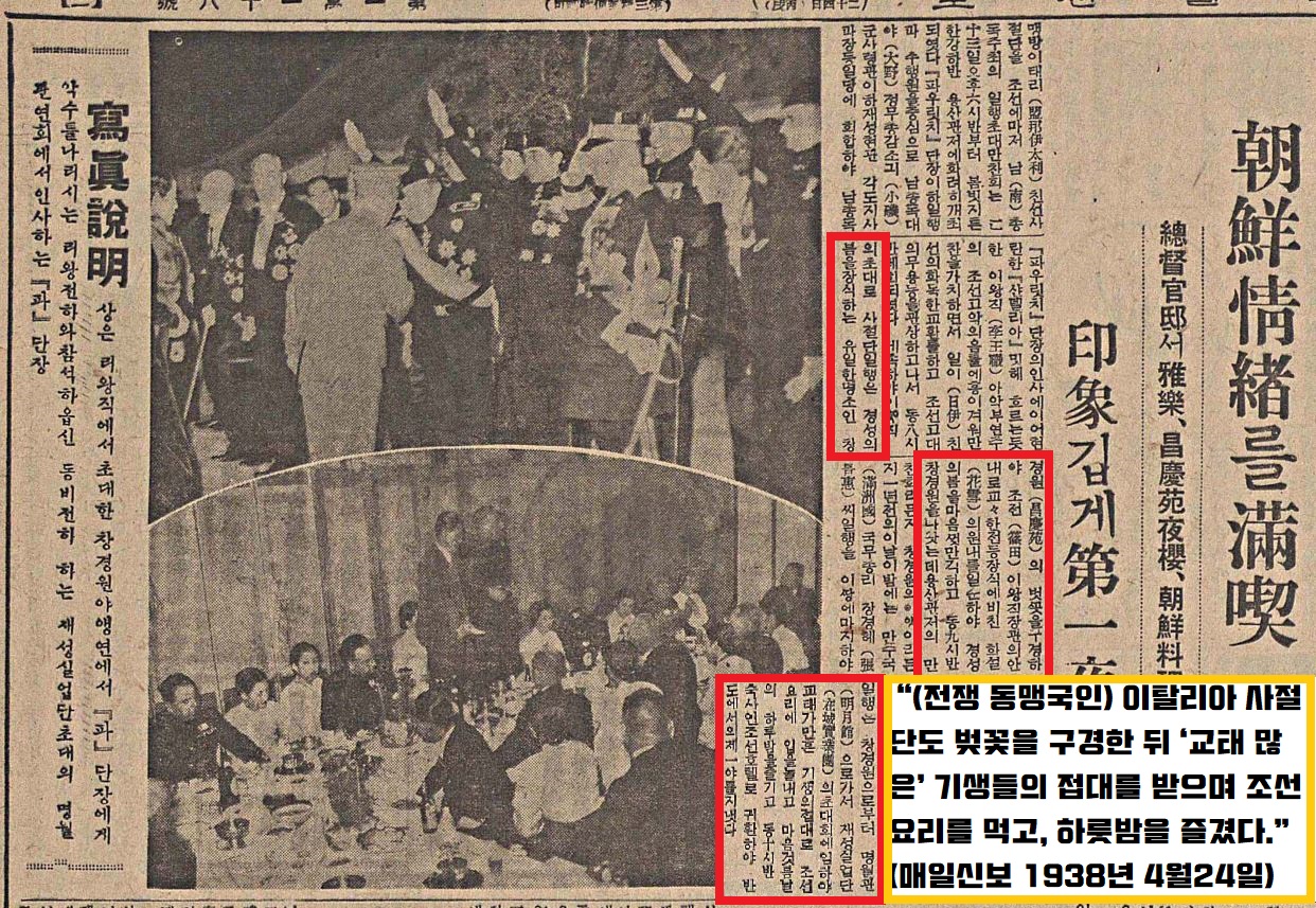 심지어는 “(전쟁 동맹국인) 이탈리아 사절단도 벚꽃을 구경한 뒤 ‘교태 많은’ 기생들의 접대를 받으며 조선요리를 먹고, 하룻밤을 즐겼다”는 기사까지 등장합니다.(매일신보 1938년 4월24일)