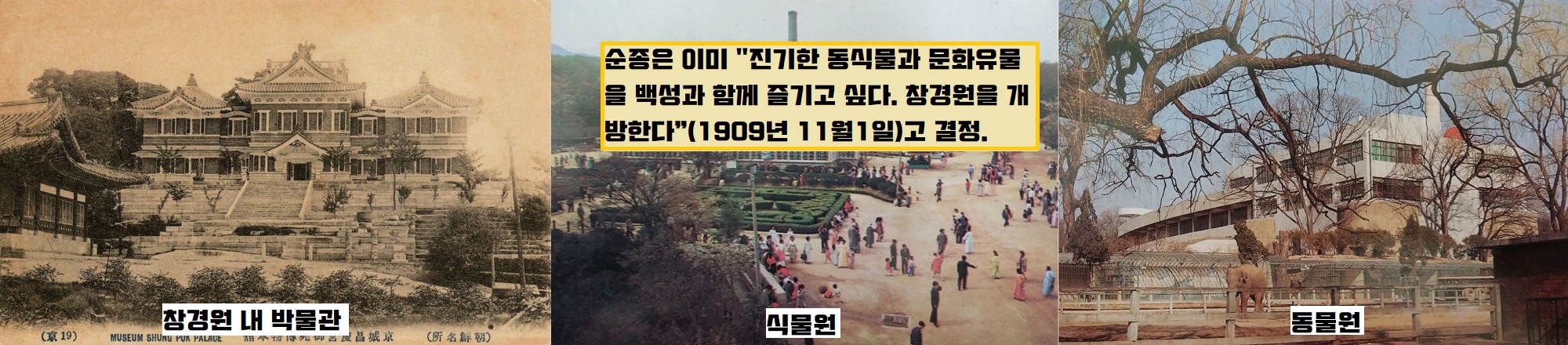 “순종이 부왕(고종)과 떨어져 살아야 할 운명이어서 매우 우울해 하고 있으니 소일거리를 찾아주면 어떠냐”고 운을 뗀 겁니다. 그러자 고미야는 “그럼 창경궁 안에 동물원과 식물원, 박물관을 조성하면 어떠냐”고 제안했는데요. 이후 일사천리로 창경궁에 동물원과 식물원이 들어서는 작업이 마무리 되구요. 순종은 “진기한 동식물과 문화유물들을 백성과 함께 즐기고 싶다”고 개방을 선언했구요(<순종실록> 1909년 11월1일). 1911년 4월 26일부터는 ‘창경궁’이 아니라 ‘창경원’으로 일컬어집니다.