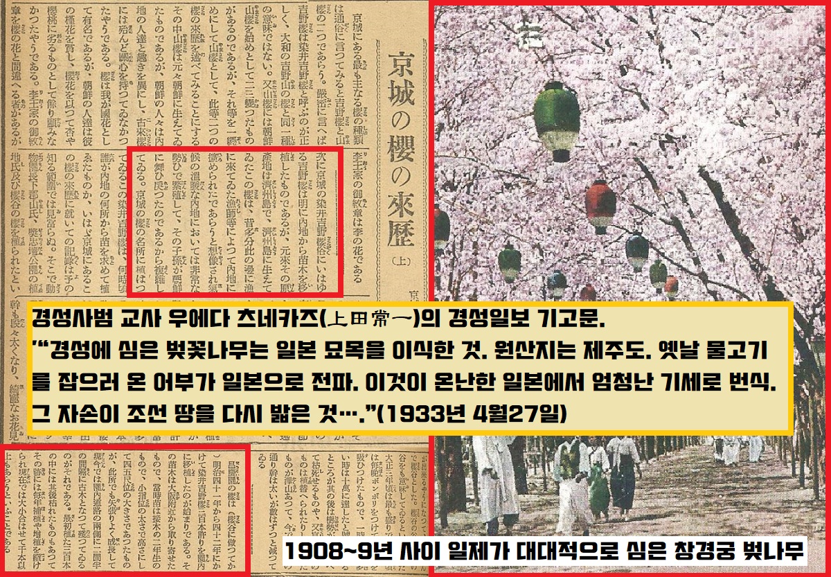 “30여 년 전(1908~9년) 구한국(대한제국)에 머물던 내지인(일본인)들이 일본 국화(國花)인 사쿠라(벚꽃)를 그리워했다. 이때 창경원, 창덕궁, 경복궁 등에 5~6년 된 사꾸라 나무를 내지(일본)에서 갖다가 심은 것이 조선 사쿠라의 시초이다.”