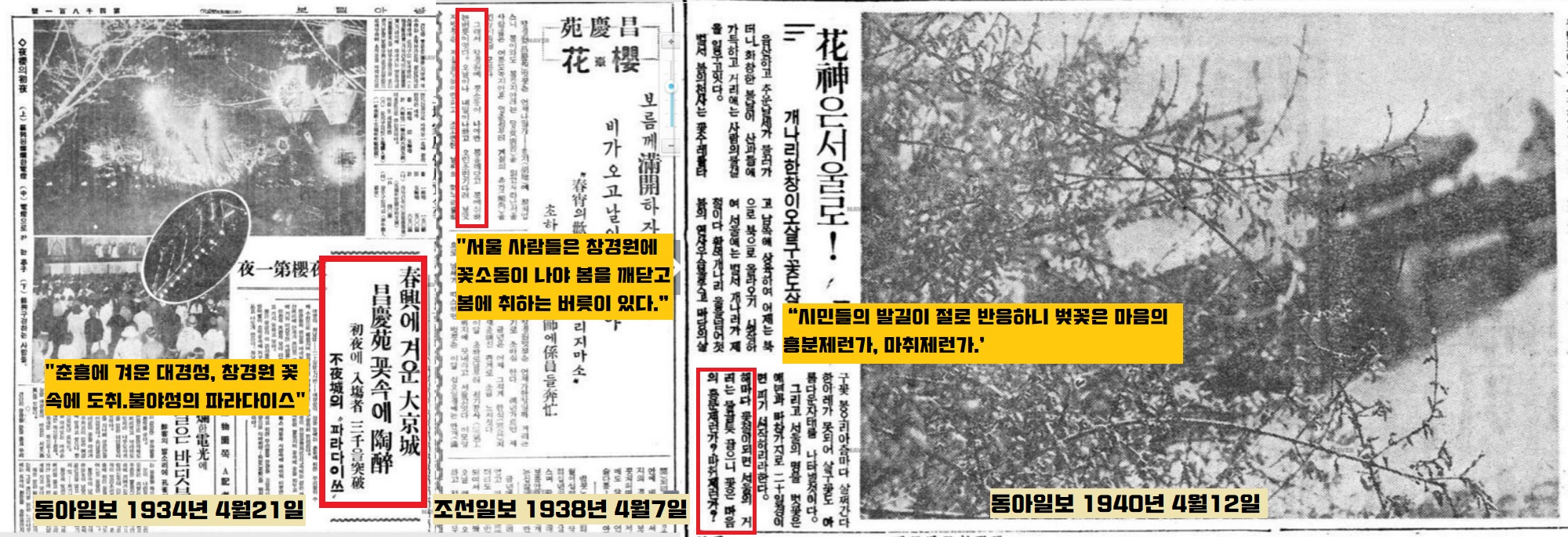 “서울 사람들은 창경원에 꽃소동이 나야 봄을 깨닫고 봄에 취하는 버릇이 있다”(조선일보 1938년 4월7일)든가, “시민들의 발길이 절로 반응하니 벚꽃은 마음의 흥분제냐, 마취제냐’(동아일보 1940년 4월12일)든가 하는 기사가 보입니다.