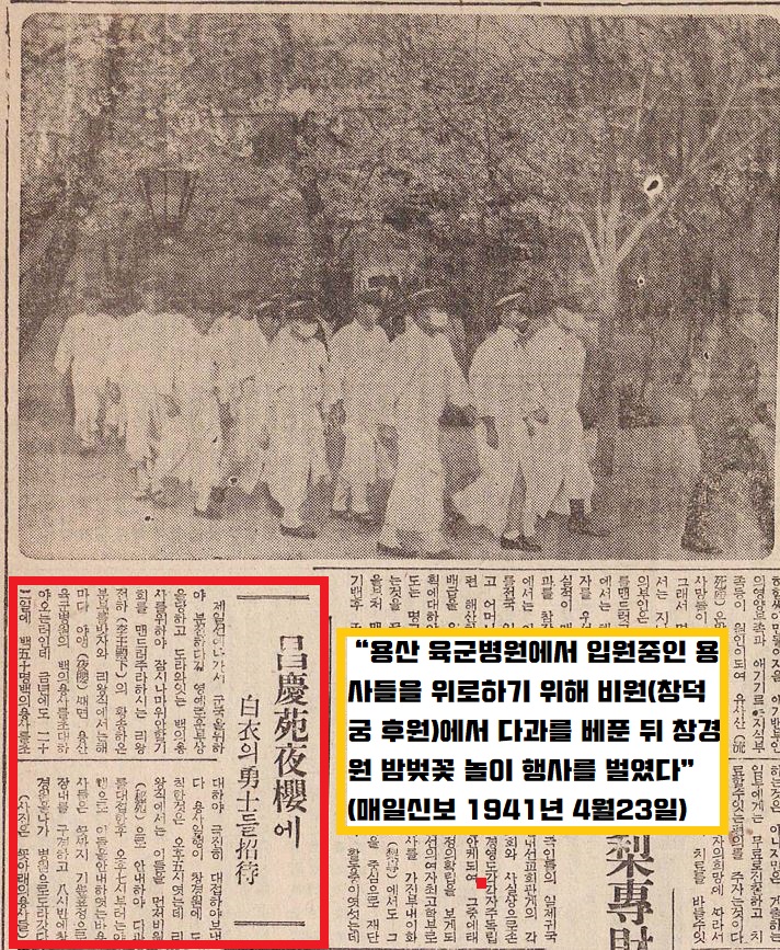 밤벚꽃 놀이가 전쟁 부상병을 위로한다는 명목으로 펼쳐지는데요. “용산 육군병원에서 입원중인 용사들을 위로하기 위해 비원(창덕궁 후원)에서 다과를 베푼 뒤 창경원 밤벚꽃 놀이 행사를 벌였다”(매일신보 1941년 4월23일)고 했습니다.