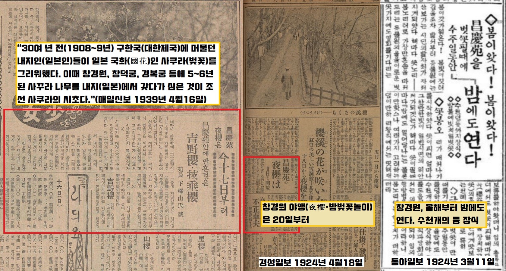 “창경원 동물원의 울타리를 이룬 벚꽃가지에…꽃봉오리가 맺기 시작…해마다 꽃이 필 때마다 밤에도 열어달라는 여론이 많았다…금년 봄 벚꽃이 만발하는 2~3주일간 야간개장하고 수천개의 전등을 장식할 계획….”(동아일보 1924년 3월11일)