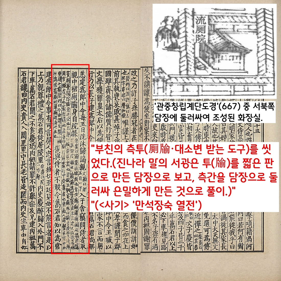 <사기> ‘만석장숙열전’은 “분(똥)을 받는 도구를 측투(厠?)”라 했다. 이 구절을 주석한 서광(352~425)은 “‘투(?)’는 짧은 판으로 만든 담장이고 측간(화장실)은 담장으로 둘러싸 은밀하게 만든 것”으로 이해했다.