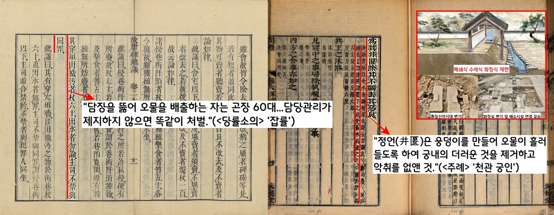 서주 시대 주나라 궁궐에는 똥·오줌을 물에 흘려보내는 ‘정언(井?)’이 있었다.(<주례> ‘천관’) 또 <당률소의>(653년 편찬)는 “담장을 뚫어 오물을 배출하는 자는 곤장 60대이며, 담당관리가 제지하지 않으면 똑같은 벌을 준다”고 했다.