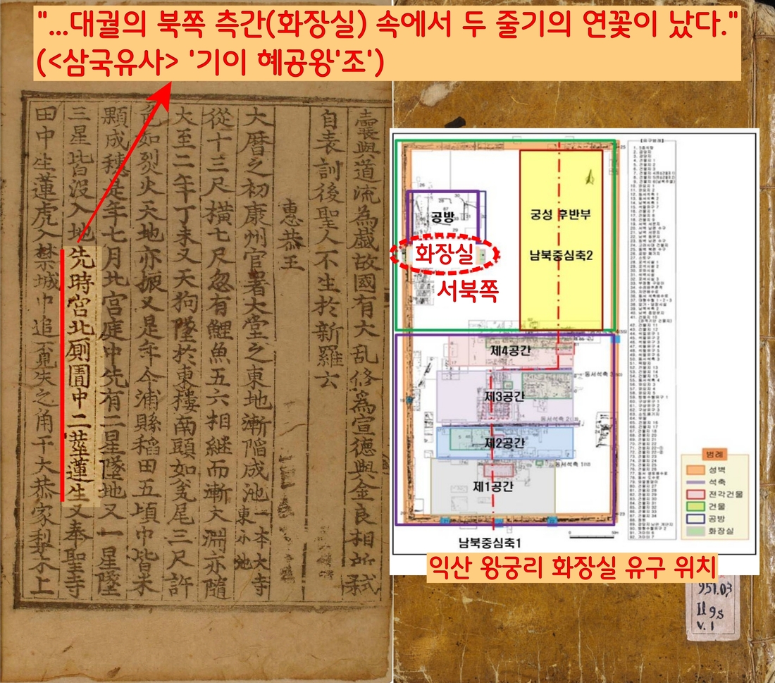 <삼국유사> ‘기이·혜공왕’조는 “대궐의 북쪽 측간에서 두 줄기의 연꽃이 났다”고 기록했다. 익산 왕궁리 화장실도 서북쪽에 있다. 화장실이 대궐의 북쪽에 존재했다는 의미다.