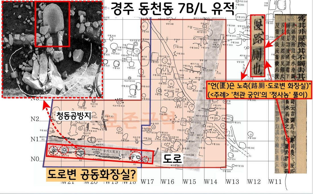 경주 동천동(7B/L) 유적에는 5개의 석조시설이 신라시대 도로변에 놓여 있었다. 이 유구는 도로를 오가는 행인이나, 인근 청동제작소에 근무하던 장인들이 사용한 공중화장실일 가능성이 짙다.|김경열의 논문에서