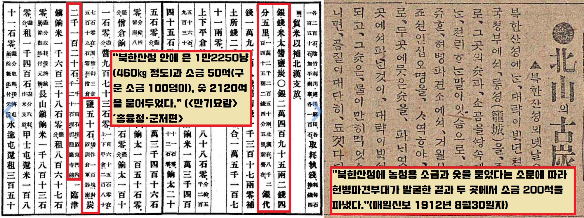 “북한산성 안에 은 1만2250냥(460㎏ 정도)과 소금 50석(구운 소금 100덩이), 숯 2120석을 묻어두었다.”