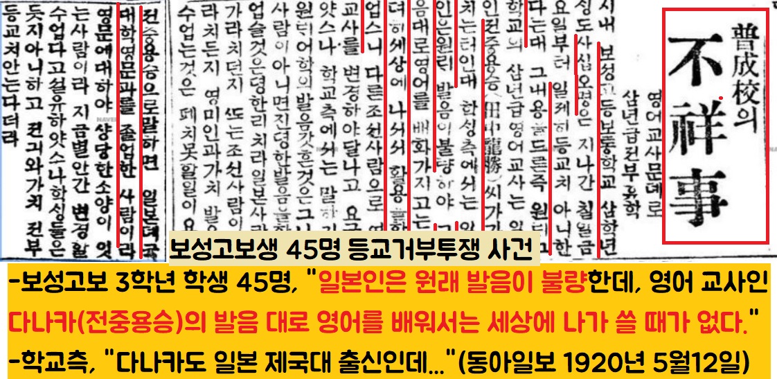 “보성고보 3학년 학생 45명이 지난 7일부터 등교하지 않는다. 일본인은 ‘원래’ 영어발음이 불량한데 영어교사인 전중용승(田中龍勝)이 가르치는 발음대로 영어를 배워서는 도저히 세상에 나가 활용할 수 없으니…”