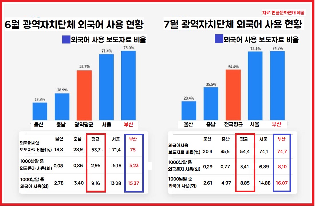 낱말 1000개 가운데 부산의 외국어 사용 횟수(6월 15.37회, 7월 16.07회)는 울산(6월 2.78회, 7월 2.61회)의 거의 6배에 이르렀답니다.