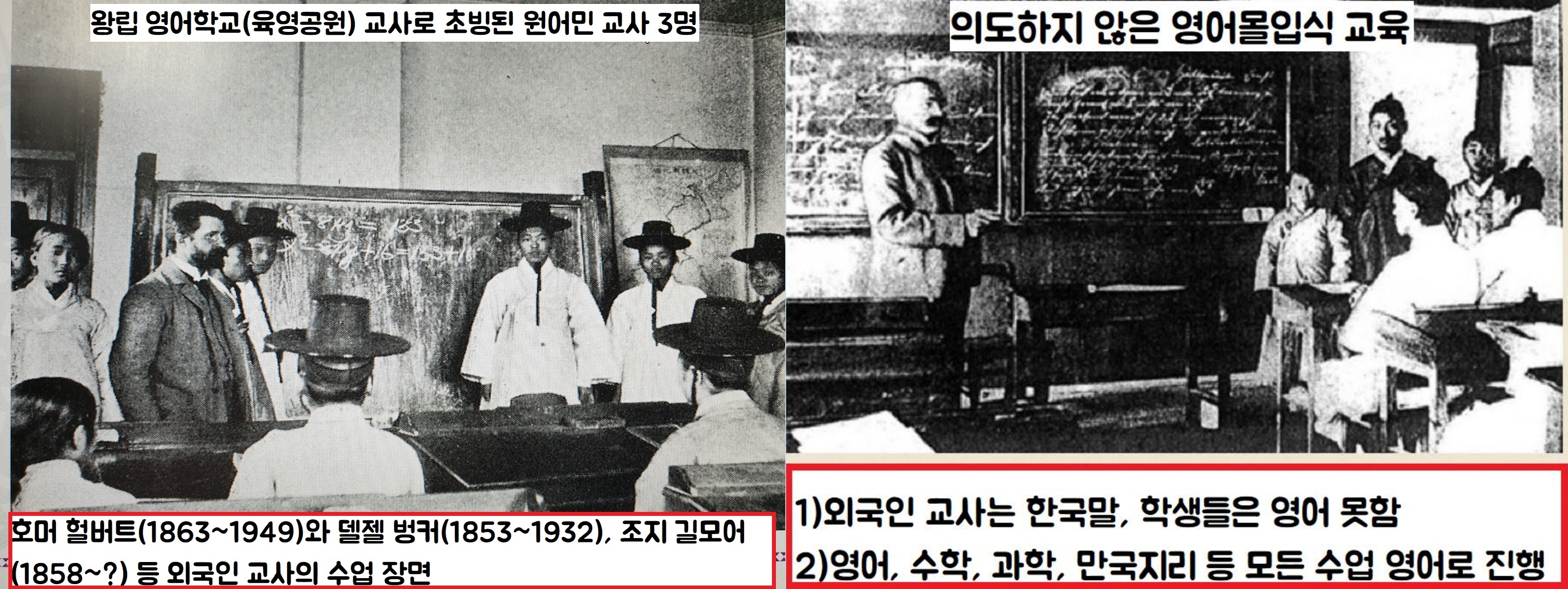 조선어를 몰랐던 이 세 선생은 어쩔 수 없이 영어 뿐 아니라, 수학·자연과학·만국지리 등 모든 과목을 원어로 가르칠 수밖에 없었죠. ‘어쩌다 영어몰입식 교육’이 된 겁니다. 그럼에도 조선인 학생들의 수학능력이 대단했답니다.