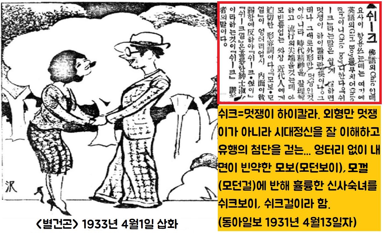 “‘쉬-크’는 멋쟁이 하이칼라를 의미한다. 쉬-크는 외형 만이 아니라 시대정신을 이해하는 빈틈없는 근대인을 가리킨다. 내면이 빈약한 모던보이, 모던걸에 반해 ‘쉬크보이’, ‘쉬크걸’은 훌륭한 신사숙녀이다.”(동아일보 1931년 4월13일 ‘신어해설’)