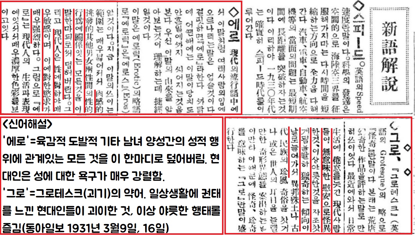 “가장 사람의 입에 오르내리는 유행어가 ‘에로틱’의 약어인 ‘에로’다. ‘그로’는 ‘그로테스크’(grotesque)의 줄임말이다. 생활에 권태를 느끼는 현대인(1920~30년대)들이 ‘괴기스러운 것’을 찾는 경향이 있어서 생긴 신조어다.”(동아일보 1931년 3월9·16일)