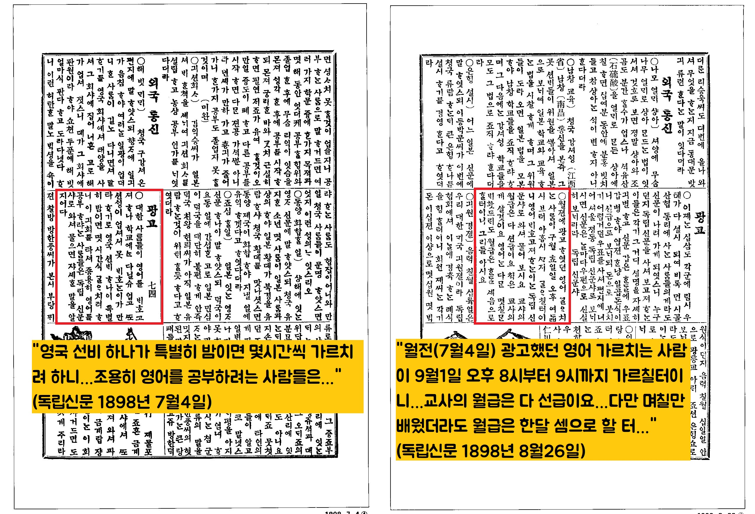 “영국 선비 하나가 특별히 밤이면 몇시간씩 가르치려 하니…조용히 영어를 공부하려는 사람들은…”(1898년 7월4일), “월전(7월4일) 광고했던 영어 가르치는 사람이 9월1일 오후 8시부터 9시까지 가르칠터이니…교사의 월급은 다 선급이요…다만 며칠만 배웠더라도 월급은 한달 셈으로 할 터…”(1898년 8월26일)라는 내용이 실려있더라구요.
