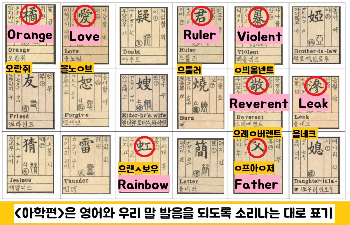 지석영의 <아학편>은 한자를 공통문자로 중심에 놓고 동아시아 3국의 자국어를 병기했습니다. 한자의 음과 훈은 물론 각 한자에 대응하는 중국어·일본어·영어의 발음까지 한글로 표기해놓은 겁니다. 한글자의 한자를 배우면 4개 국어를 배울 수 있다는 장점이 있구요. 한자 한 글자마다 붙인 영어와 우리말 발음을 되도록 소리나는 대로 표기하려 애썼다는 것이 흥미롭죠.