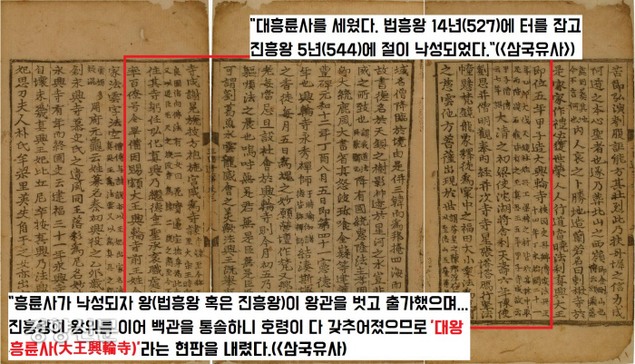 “진흥왕이 (법흥왕의 뒤를 이어) 임금의 자리에 올라 백관을 통솔하니 호령이 다 갖추어졌으므로 ‘대왕흥륜사(大王興輪寺)’라는 현판을 내렸다”는 구절을 봅시다. 만약 ‘~왕흥륜~’이 맞다면 <삼국유사>의 ‘대왕흥륜사’ 구절과 부합되죠.