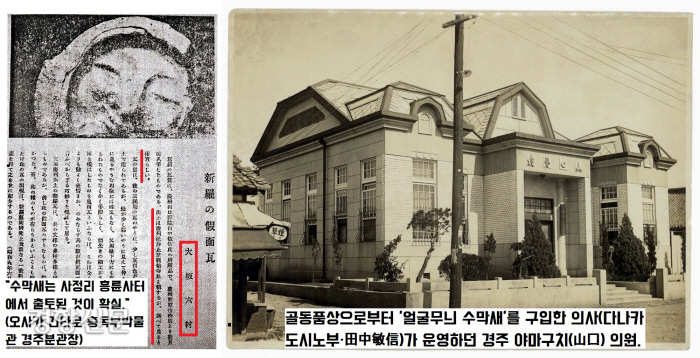 ‘얼굴무늬 수막새’ 출토지를 둘러싸고 혼선도 빚어집니다. 얼굴무늬 수막새는 1934년 경주 시내 야마구치(山口) 의원의 의사인 다나카 도시노부(田中敏信)가 골동품상에서 구입한 것인데요. 그런데 조선총독부 박물관 경주분관장이던 오사카 긴타로(大坂金太郞)가 ‘수막새 출토지=사정리 흥륜사터’로 전하면서 “조사해보니 확실하다”고 못박았습니다.