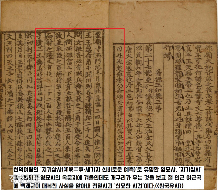 ‘지기삼사’ 중 하나가 영묘사의 옥문지에 겨울인데도 개구리가 우는 것을 보고 절 인근 여근곡에 백제군이 매복한 사실을 알아내 전멸시킨 ‘신묘한 사건’입니다.(<삼국유사>)
