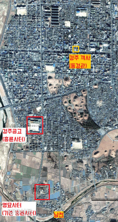 또 <신증동국여지승람> ‘고적’조는 “흥륜사가 경주부 남쪽 2리에 있다”고 했습니다. 그런데 조선시대 경주 읍성내의 객사와 현재 경주공고의 실제거리는 1.2㎞인데요. <신증동국여지승람>이 언급한 ‘2리(약 1.3㎞)’와 비슷합니다.