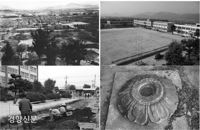 운동장 정지작업 도중 건물터의 기단과 석등의 밑받침돌 등이 노출된 겁니다. 1987년 교사신축 때도 기와와 전돌류가 출토되었습니다. 또한 2008년 운동장 배수구 설치를 위한 발굴조사 결과 결정적인 명문기와편이 확인됩니다.