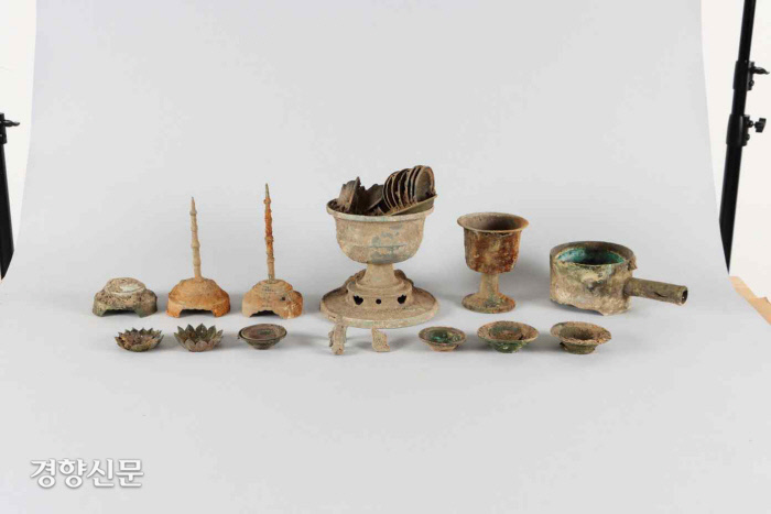 솥 안에는 향로와 향완(향 그릇), 촛대 등의 청동공양구와 금강저 같은 청동의식구, 청동소완(반찬그릇) 등이 보였습니다. 현재 육안으로 확인되는 유물만 54점 정도 되었고요.