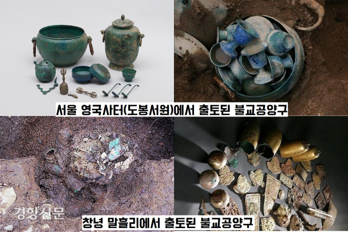 그중 ‘영국사터(서울 도봉서원)’ 발굴사례가 대표적인데요. 2012년 절의 건물터 기단에서 청동유물 79점이 일괄로 출토되었는데요. 특히 이 청동유물을 매납할 때 따로 구덩이를 판 흔적이 없다는 것이 눈길을 끌었습니다. 이것은 영국사의 건물 기단을 조성할 때 일종의 진단의식을 펼친 뒤 청동 용품을 고이 모셔둔 흔적이라는 겁니다.