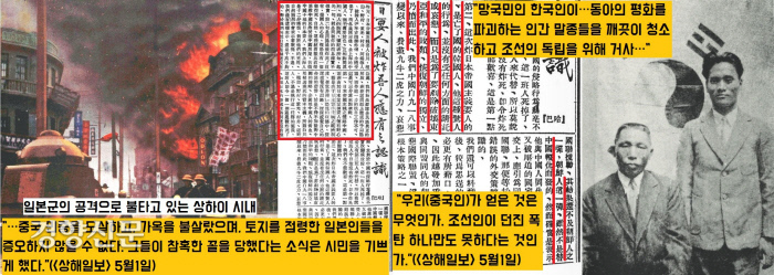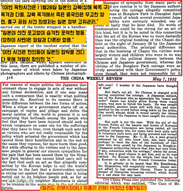 “훙커우 사건 희생자는 일본 정부와 관련된 요인들뿐이다…(반면)일본이 중국에 선전포고도 없이 습격한 포악한 행동(상하이 사변)은 암살이나 다름 없다…이번 사건은 한인들이 일본의 압박을 견디다 못해 저항한 행동이다.”(5월7일)
