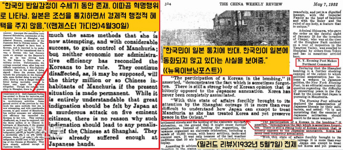 예컨대 영국의 <데일리 텔레그래프>는 “폭탄투척자는…1910년 일본의 조선합병후 조선독립운동에 가담해 테러행위에 적극 참가한 죽음을 두려워하지 않는 자들 가운데 한 명”(4월30일)이라고 전했습니다.