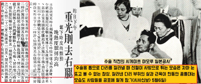 일본공사 시게미쓰는 64곳이나 파편이 박힌채 혼수상태로 이송됐고요. 일주일만에 오른쪽 다리를 절단했습니다.