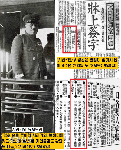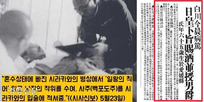 23일 새벽 시라카와는 완전히 의식을 잃고 혼수상태에 빠졌습니다. 그러자 일본 본토의 일왕까지 나서 난리를 피웠습니다. 일왕 히로히토(裕仁)는 시라카와에게 ‘사주(賜酒·임금이 공을 세운 신하에게 내리는 술)’와 함께 욱일 대훈장과 남작의 작위까지 주었습니다. 5월24일 혼수상태에 빠진 시라카와의 병상에서 기묘한 의식까지 펼쳤습니다.