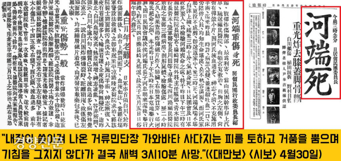 “가와바타는 내장이 쏟아진채 꿇어앉아 ‘사람살리라’고 소리 질렀다. 시라카와는 왼뺨에 파편이 박혔다. 시게미쓰는 오른쪽 다리에 부상을 입고 졸도했고, 노무라는 왼쪽 눈알이 튀어나왔다.”(<시사신보> 4월29일 <신보> 4월30일)