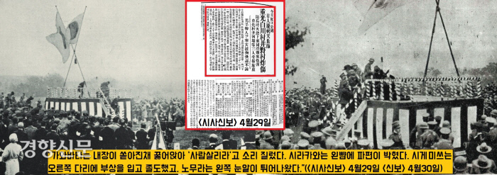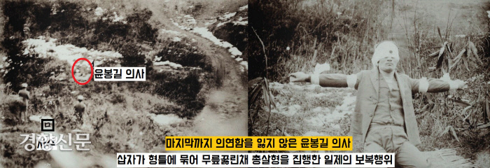 이를 두고 <상해보>는 “일본은 시라카와의 무덤에 윤봉길 의사를 순장시키려고 한다”(5월31일)는 의혹을 제기했습니다. 아닌게 아니라 일본은 그해 12월19일 가나자와(金澤) 교외인 육군작업장에서 윤의사의 무릎을 꿇리고 십자가 형틀에 묶은채 총살형을 집행했습니다. 누가봐도 보복적인 사형집행이었습니다. 그렇지만 윤의사는 순국하는 그 순간까지도 추호의 흐트러짐이 없었습니다.