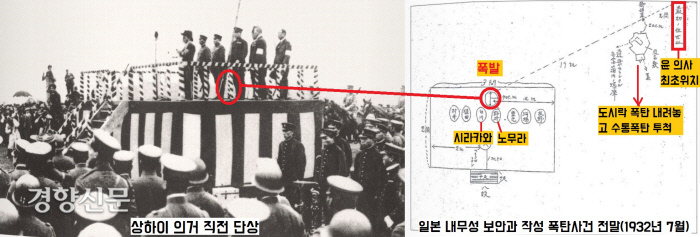 단상에는 시라카와와 함께 제3함대 사령관 노무라 기치사부로(野村吉三郞·1877~1964) 중장, 제9사단장인 우에다 겐키치(植田謙吉·1875~1962) 중장 등 군 수뇌부가 자리를 잡았고요. 상하이 총영사 무라이 쿠라마쓰(村井倉松·1888~1953), 일본공사 시게미쓰 마모루(重光葵·1887~1957), 일 거류민 단장 가와바타 사다지(河端貞次·1874~1932), 거류민단 서기장인 도모노 모리(友野盛) 등도 도열했습니다. 이제 중국신문 등 당대 언론의 보도를 통해 그 날의 ‘의거’를 복기해보겠습니다.