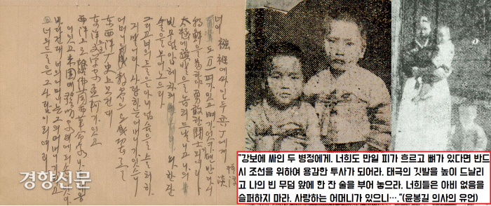 공개된 유품 중 특히 눈에 띈 것은 윤봉길 의사의 자필 이력서 및 유서인데요. 이중에서도 윤봉길 의사가 어린 두 아들에게 남긴 유언이 심금을 울립니다. “강보에 싸인 두 병정에게. 너희도 만일 피가 흐르고 뼈가 있다면 반드시 조선을 위하여 용감한 투사가 되어라. 태극의 깃발을 높이 드날리고 나의 빈 무덤 앞에 한 잔 술을 부어 놓으라. 너희들은 아비 없음을 슬퍼하지 마라. 사랑하는 어머니가 있으니….”