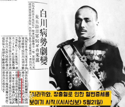 그러나 초기 상태는 나쁘지 않았습니다. 일본 육군병원 측도 “출혈이 심하지 않아 4주 정도면 완치할 수 있을 것”이라 낙관했고요.(<시보> 5월1일) <시사신보>는 “평소 술을 좋아한 시라카와가 브랜디를 찾고 있으며 문병 온 지인들과도 환담을 나눴다”(5월4일)고 전했습니다. 그러나 5월21일이 되자 상황이 급변합니다. 시라카와의 병세가 급격히 악화됩니다.