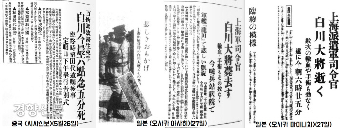 “일본은 이번 전쟁을 승전이라 큰소리치고 있지만…전쟁통에 노무라와 우에다가 다치고 시라카와의 사망소식이 들려오자 상하이의 모든 시민은 폭죽을 터뜨리며 환호했다.”(<상해보> 1932년 5월25일)
