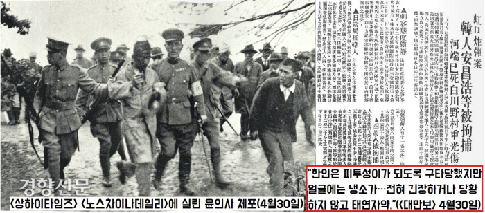 윤의사는 거사 후 곧 체포됐습니다. <대만보> 등은 “윤봉길 의사는 피투성이가 될 정도로 구타당했지만 그의 얼굴에는 냉소가 흘러나왔고, 전혀 긴장하거나 당황하는 모습을 보이지 않고 태연자약했다”(4월30일)고 덧붙였습니다.